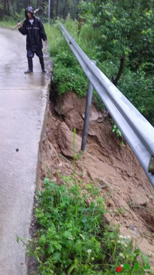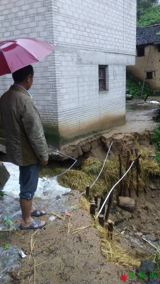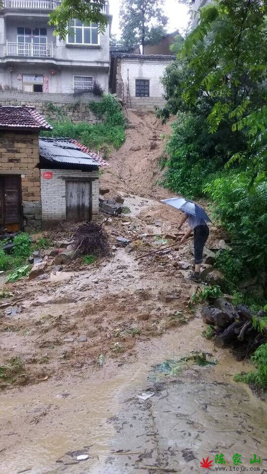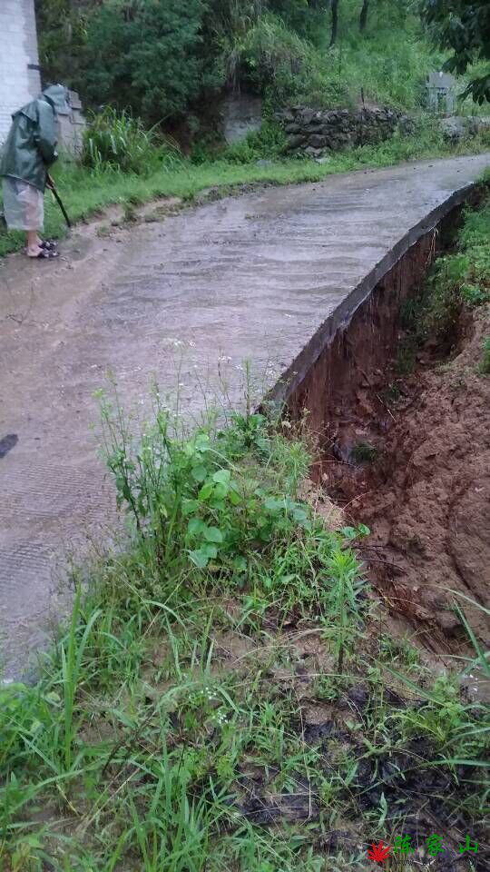 暴雨影响胜利镇陈家山村部分公路路面,村民房屋